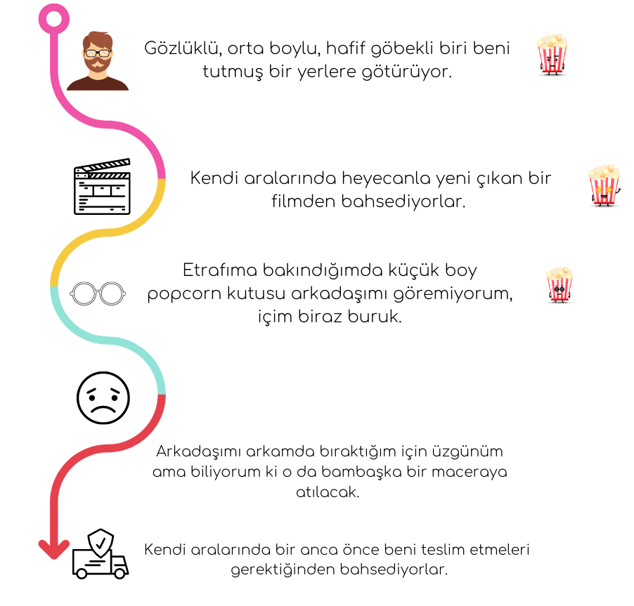 Gözlüklü, orta boylu, hafif göbekli biri beni tutmuş bir yerlere götürüyor. Kendi aralarında heyecanla yeni çıkan bir filmden bahsediyorlar. Etrafıma bakındığımda küçük boy popcorn kutusu arkadaşımı göremiyorum, içim biraz buruk. Onu arkada bıraktığım için ama biliyorum ki o da bambaşka bir maceraya atılacak.